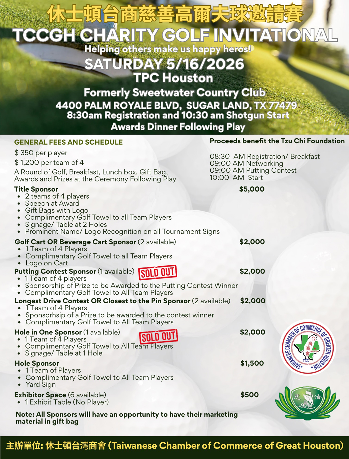 休士頓台灣商會與慈濟聯合舉辦的慈善高爾夫球賽,5月16日將於TPC Houston Formerly Sweetwater Country Club舉行,歡迎有志一同的球友共襄盛舉。上午8點半開始接受登記,10點半開打。