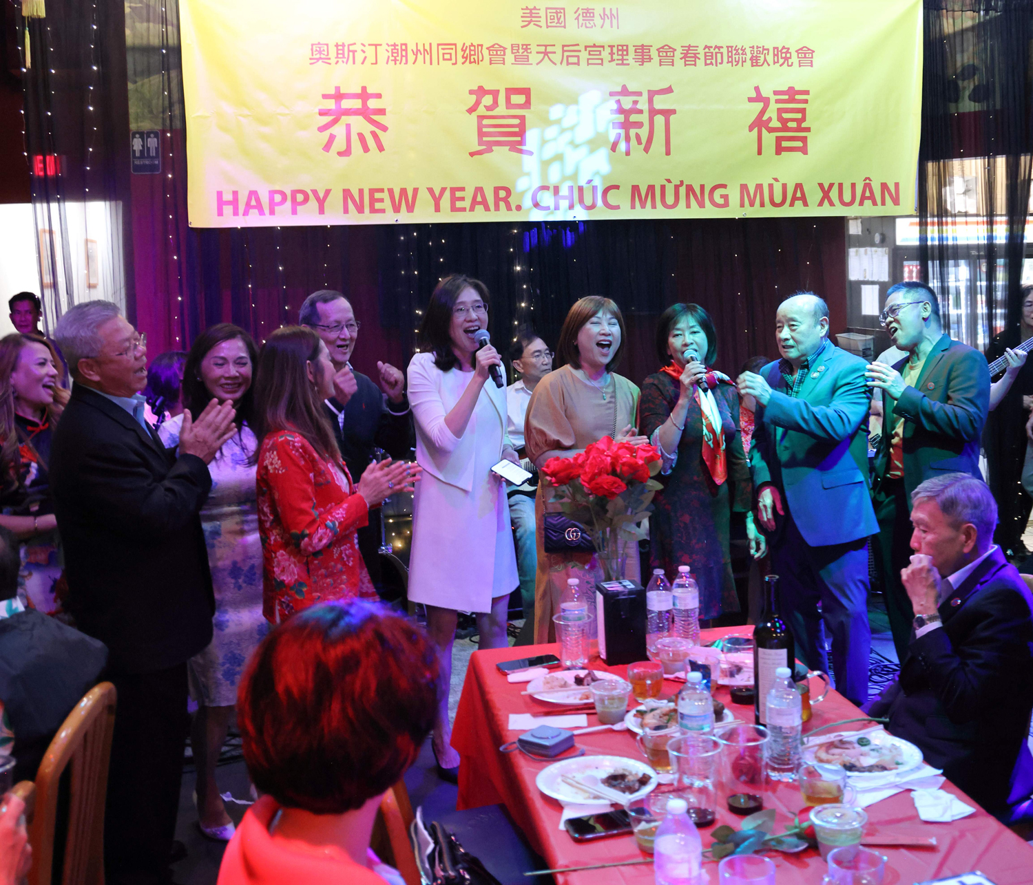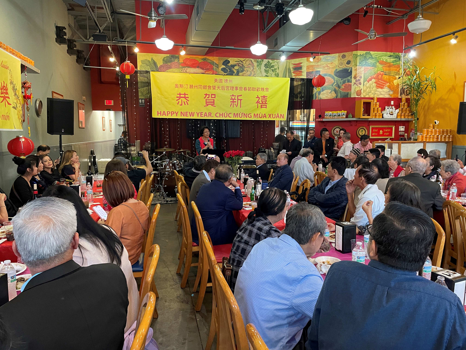 當晚潮州同鄉會暨天后宮理事會春節聯歡晚會於Pho Hoang餐廳舉行,蕭伊芳處長、王盈蓉主任與陳泰洲董事長、吳昌武會長、陳登茂董事、顏世光董事及奧斯汀理事鄉親等來賓百人出席盛會,活動由許健雄及副會長亦為餐廳老闆黃洲主持,蕭伊芳致詞表示,潮州人一路顛沛流離從家鄉到美國落地深根發展事業,過程艱辛,更可以看出潮州人在他鄉的團結及堅韌毅力,令人感佩,並感謝奧斯汀潮州同鄉會在奧斯汀凝聚潮州鄉親的貢獻!