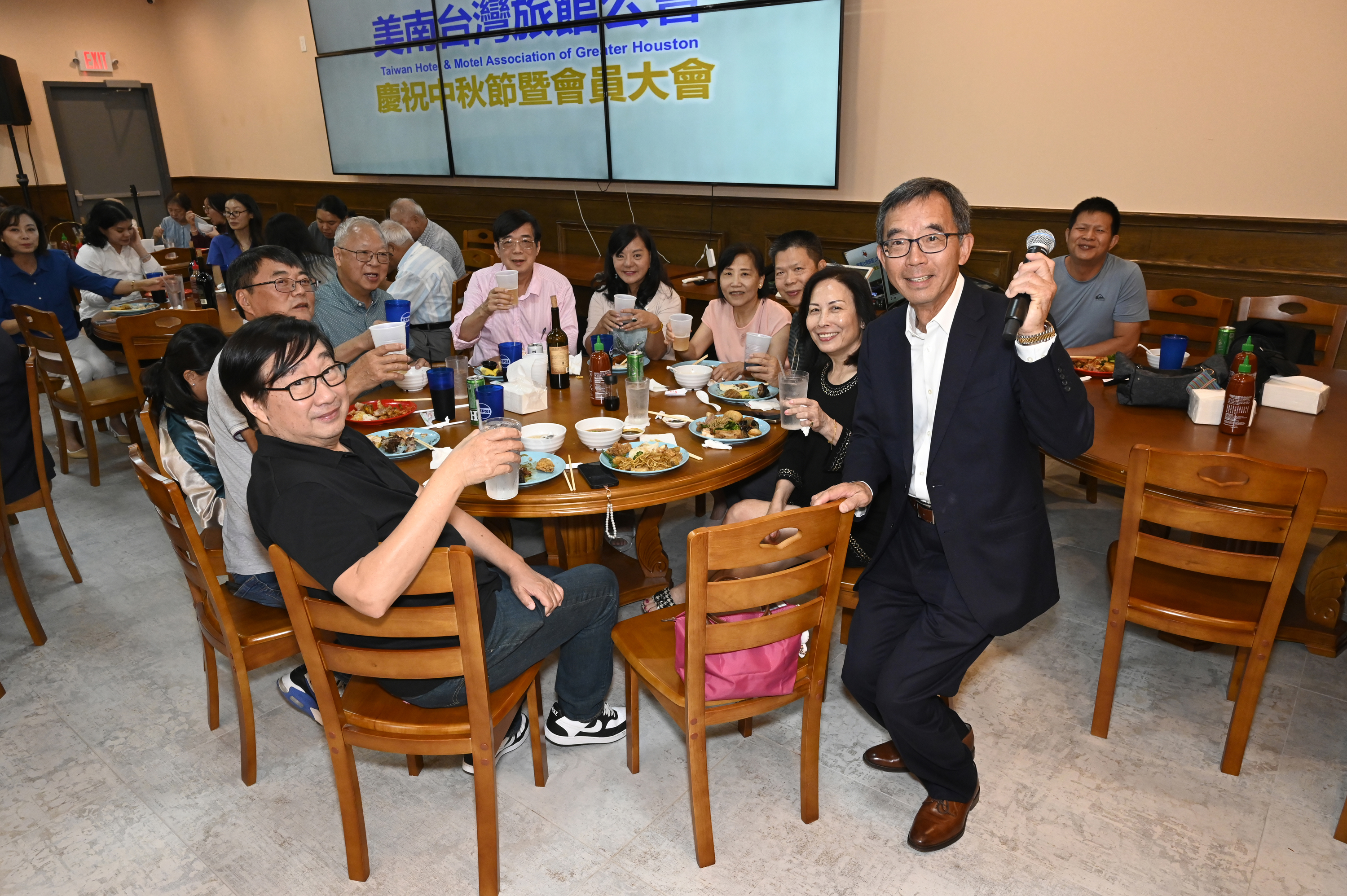 美南台灣旅館公會10月份的一場會員慶中秋活動,將休士頓地區的華裔重量級旅館業者,全都聚集在一起,享受美食佳餚之餘,也輕鬆歡唱分享故事(嚴杰會長介紹旅館公會歷史)。