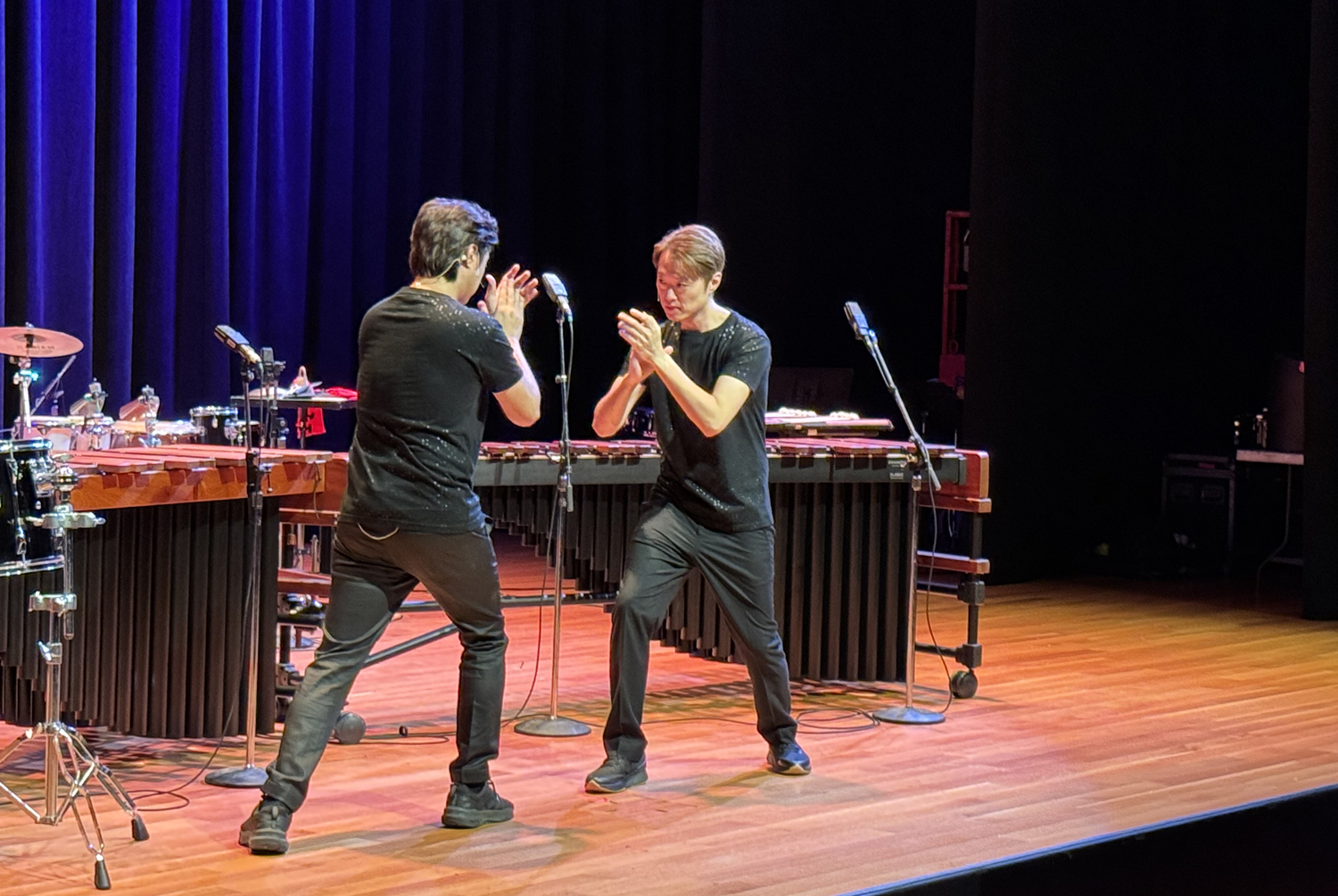 雙胞胎打擊演奏家簡任廷(左)、簡任佑(右)用擊掌帶動現場觀眾的參與。(駐休士頓辦事處臺灣書院提供)
