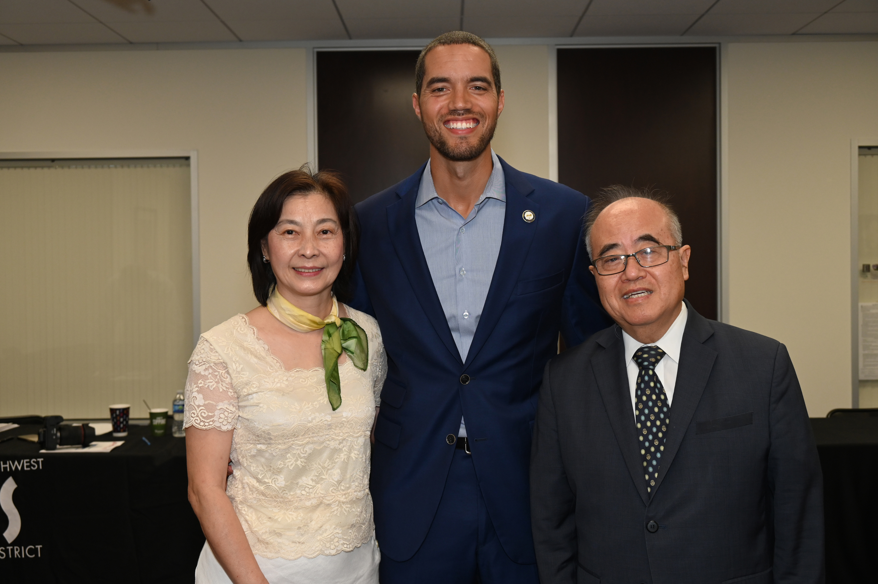 Chris Hollins(中)訪西南區管理委員會後,與亞裔社區總監芮久玟(左)和該區主席李雄(右)合影。。