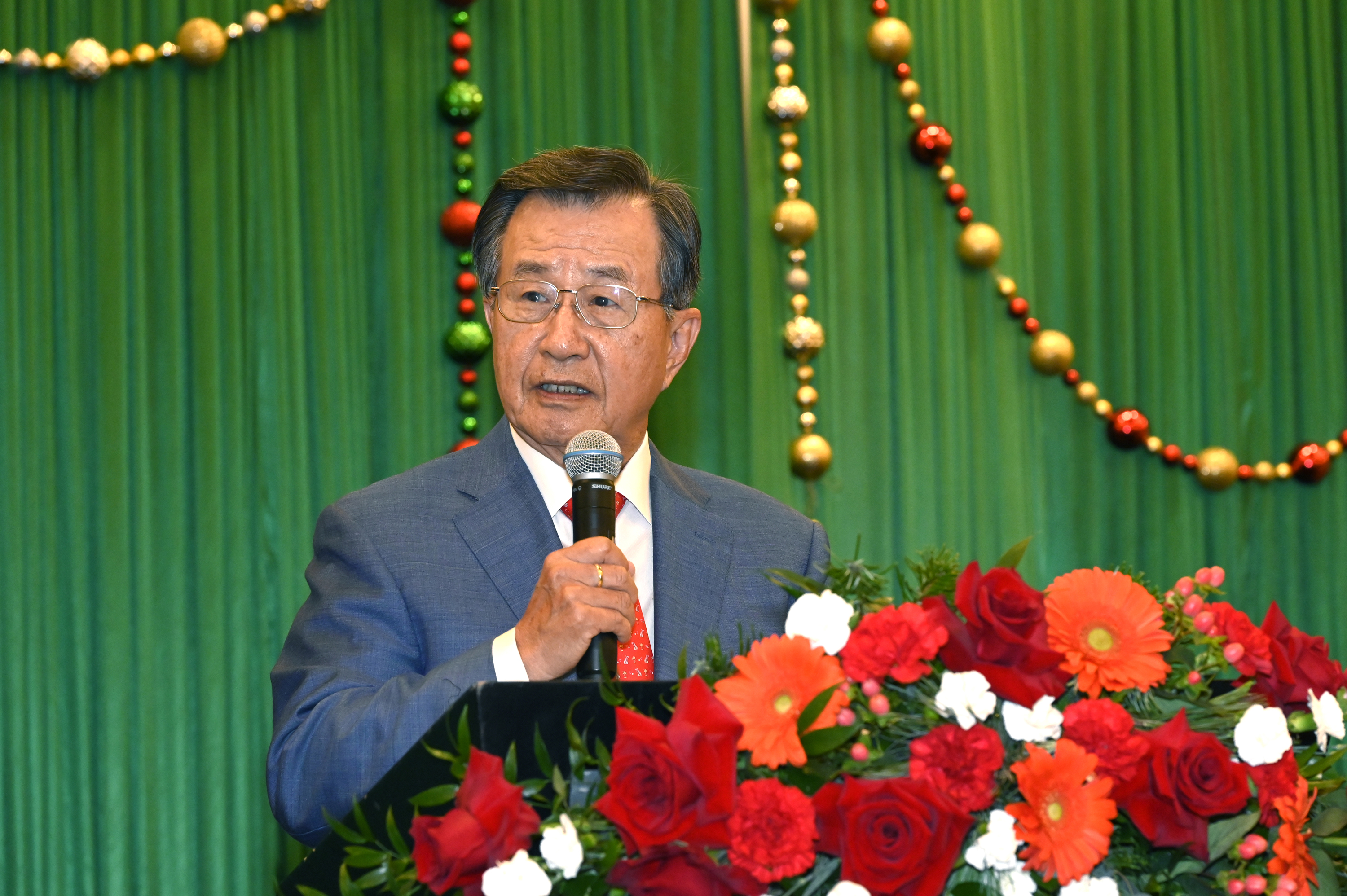 金城銀行董事長吳光宜在2025年聖誕派對上致詞。