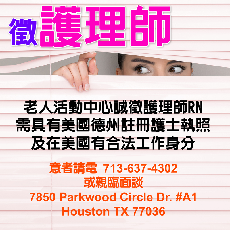 (徵人啟事) 老人活動中心 誠徵護理師RN, 須具有美國德州註冊護士執照及在美國有合法工作身分。 意者請電: 713-637-4302 或親臨: 7850 Parkwood Circle Dr. Suite A1, Houston TX 77036